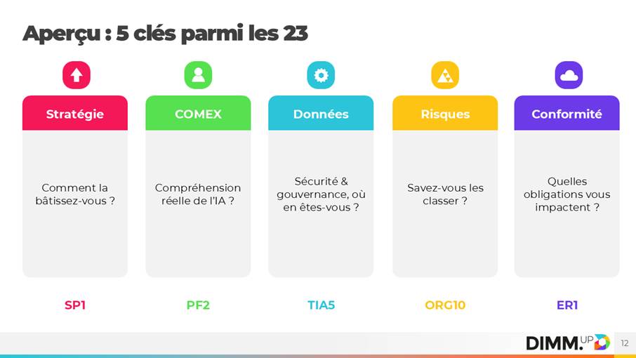 En s’appuyant sur plus de 600 diagnostics réalisés dans plus de 20 pays, DIMM.UP a créé un cadre de réflexion sur l’IA pour les dirigeants : les 23 clés IA.